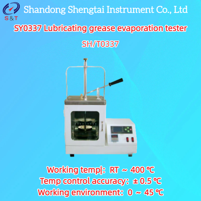 SY0337 윤활유 그리스 증발 시험기 이 기기는 SH/T0337 표준에 따라 설계 및 제조되었으며, 윤활유 그리스의 증발을 측정하는 데 적합합니다. 1mm 두께의 윤활유 그리스로 채워진 증발 접시를 특수 온도 조절기에 넣고 지정된 온도에서 1시간 동안 (또는 윤활유 그리스 제품 표준에 명시된 대로) 유지하여 질량 손실을 측정합니다.
