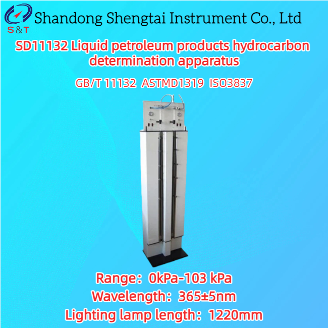 SD11132 액체 석유 제품 탄화수소 계량기는 중화인민공화국 표준 GB/T 11132-2002 "탄화수소 액체 석유 제품 결정 방법(형광성 지표 흡착 방법)"의 법률에 따라 설계 및 제조에 규정된 요구 사항에 따라 표준 GB/T 11132 주요 탄화수소에 규정된 대로 실리카겔 흡착 컬럼에 표시되는 형광성 지표가 있는 액체 석유 제품의 주요 탄화수소에 접근하여 부피 백분율을 계산합니다. 엔진 연료, 항공 연료 측정 지표와 같은 연료유.