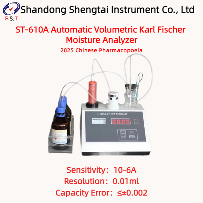 The ST-610A Automatic Karl Fischer Volumetric Moisture Analyzer is an automatic analytical instrument that uses the Karl Fischer volumetric titration method to determine moisture content. It is an ideal instrument for moisture detection in production and scientific research. It is primarily suitable for the determination of moisture in products across industries such as pharmaceuticals,ganic and inorganic chemicals, petrochemicals, fertilizers, pesticides, dyes, coatings, food and beverages, surfactants, and cosmetics.